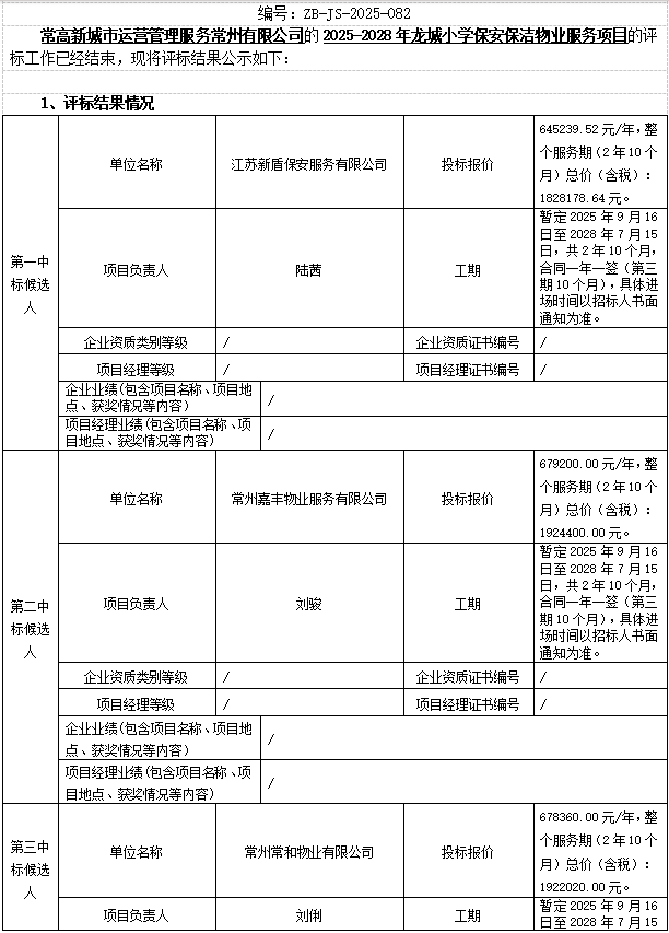 2025-2028年龍城小學保安保潔物業(yè)服務項目中標結果公示