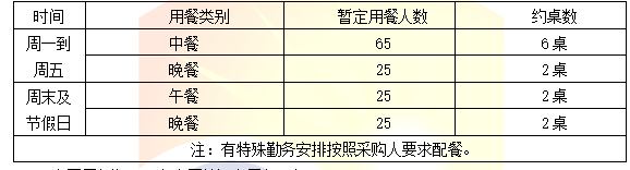 采購(gòu)需求:主要包括提供食堂全年所有食材,調(diào)料、食堂洗滌用品、清潔用品等消耗品,提供該食堂的廚師、幫廚等。