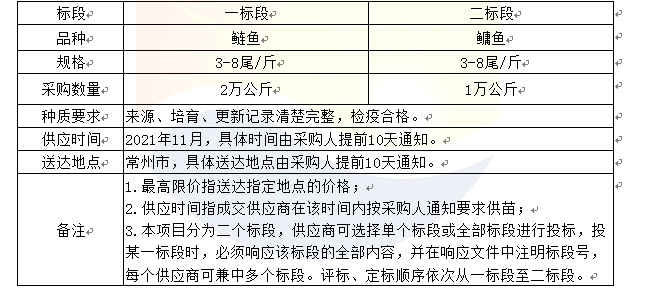 采購需求:本項(xiàng)目是2021年第一批長江增殖放流苗種項(xiàng)目,在長江常州段水域開展?jié)O業(yè)資源增殖流放工作,在長江常州段放鰱魚以及鳙魚魚種,由于采購數(shù)量及苗種品種不同,因此本項(xiàng)目分為二個(gè)標(biāo)段,采購清單如下:
